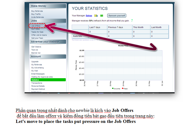 Phần quan trọng nhất dành cho newbie là kích vào Job Offers